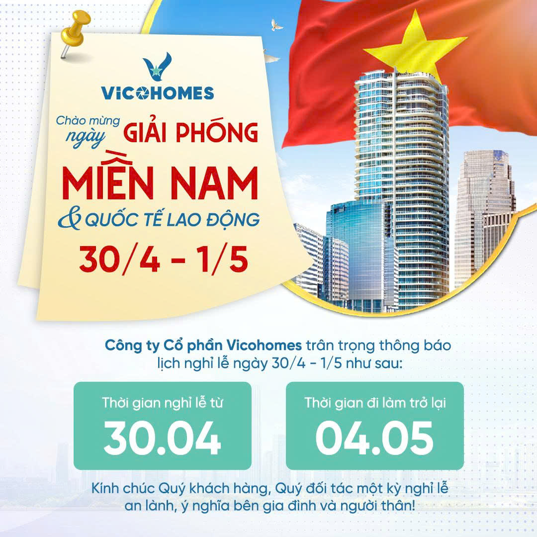 Trong không khí hân hoan chào mừng kỷ niệm Ngày Giải phóng miền Nam (30/04) và Ngày Quốc tế Lao động (01/05), Công ty Cổ phần Vicohomes xin trân trọng thông báo lịch nghỉ lễ để Quý vị tiện theo dõi và sắp xếp công việc: