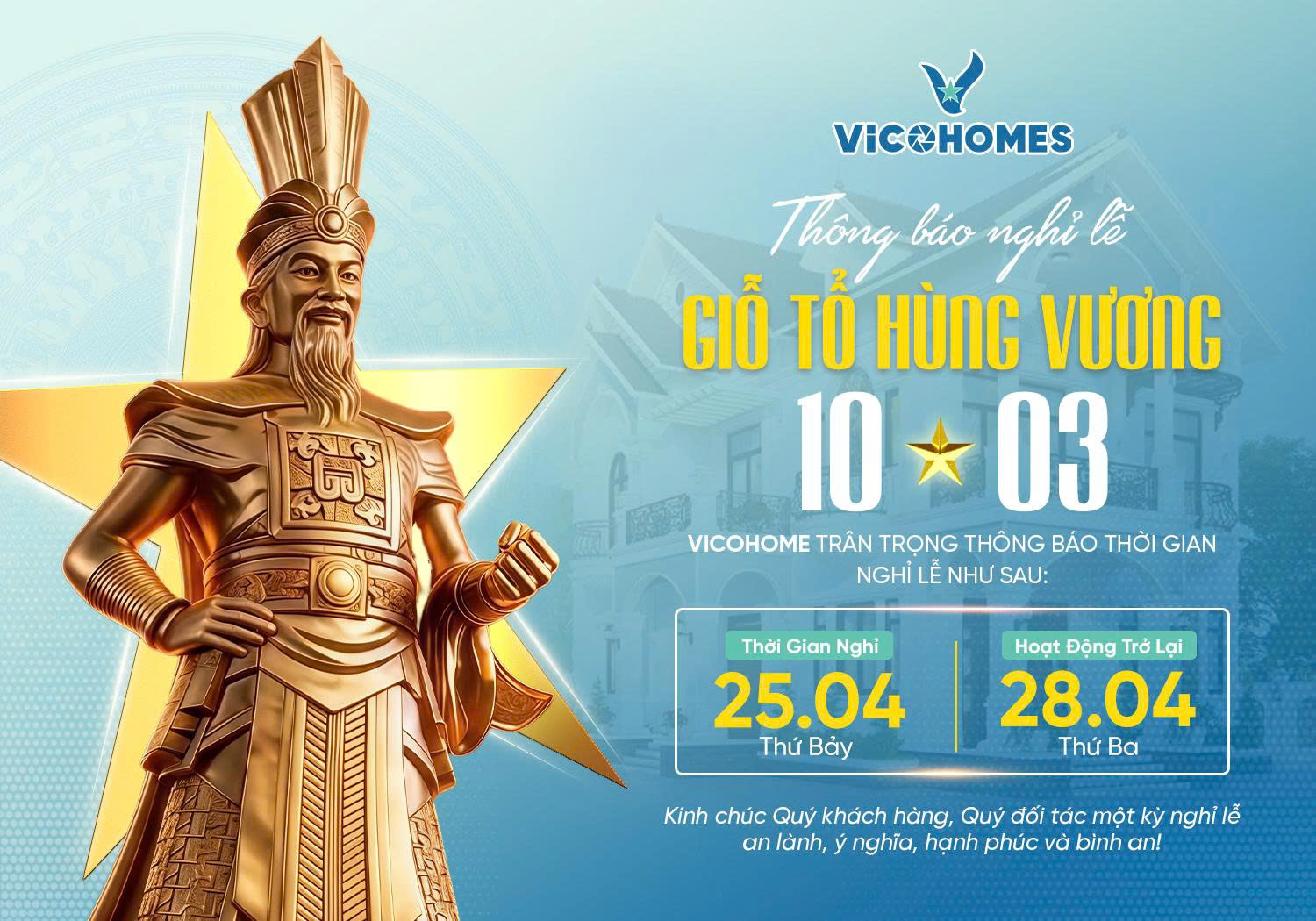 Trong không khí trang nghiêm của ngày Quốc giỗ, Công ty Cổ phần Vicohomes xin trân trọng thông báo lịch nghỉ lễ Giỗ Tổ Hùng Vương năm 2026 để Quý khách hàng, Đối tác có thể chủ động trong việc liên hệ và sắp xếp công việc: